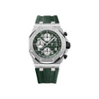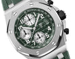 Unworn Audemars Piguet Royal Oak Offshore SELFWINDING CHRONOGRAPH 26238TI.OO.A056CA.01. 42 mm, Khaki green dial with “Mega Tapisserie” pattern, silver-toned counters, arabic numerals hour-markers and white gold Royal Oak hands with luminescent coating, khaki green inner bezel, Titanium case and bezel, glareproofed sapphire crystal and caseback, black rubber pushpieces and screw-locked crown, titanium pushpiece guards, 4404 calibre, Selfwinding movement, 70 h power reserve, 40 jewels, Khaki green rubber strap with AP folding clasp. Water resistant to 100 m.