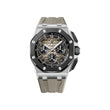 Unworn Audemars Piguet Royal Oak Offshore SELFWINDING CHRONOGRAPH 26420SO.OO.A600CA.01. 43 mm, Smoked light brown dial with “Méga Tapisserie” pattern, black counters and external zone, white gold applied hour-markers, white gold Royal Oak hands with luminescent coating, black inner bezel, Stainless steel case, glareproofed sapphire crystal and caseback, black ceramic bezel, pushpieces and screw-locked crown, sandblasted stainless steel pushpiece guards, 4401 calibre, Selfwinding movement, 70 h power reserve, 40 jewels, Light brown rubber strap with AP folding clasp. Water resistant to 100 m.