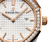 Unworn Audemars Piguet Royal Oak QUARTZ 67651SR.ZZ.1261SR.01. 33 mm, Silver-toned dial with “Grande Tapisserie” pattern, pink gold applied hourmarkers and Royal Oak hands with luminescent coating, Stainless steel case, 40 brilliant-cut diamonds ; ~0.73 carats bezel, Quartz movement, 7 Jewels, Stainless steel and 18-carat pink gold bracelet with stainless steel AP folding clasp. Water resistant to 50 m.