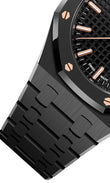 Unworn Audemars Piguet Royal Oak SELFWINDING "50TH ANNIVERSARY" 77350CE.OO.1266CE.01.A. 34 mm, Black dial with “Grande Tapisserie” pattern, pink gold applied hour-markers and Royal Oak hands with luminescent coating, Black ceramic case and 18-carat pink gold screws, glareproofed sapphire crystal and titanium sapphire caseback, 5800 calibre, Selfwinding movement, 28 jewels, Ceramic bracelet with AP folding clasp. Water resistant to 50 m.