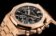 Unworn Audemars Piguet Royal Oak SELFWINDING CHRONOGRAPH "50TH ANNIVERSARY" 26240OR.OO.1320OR.02. 41 mm, Black dial with “Grande Tapisserie” pattern, black counters, pink gold applied hour-markers and Royal Oak hands with luminescent coating, 18-carat pink gold case, glareproofed sapphire crystal and caseback, screw-locked crown, 4401 calibre, Selfwinding movement, 70 h power reserve, 40 jewels, 18-carat pink gold bracelet with AP folding clasp. Water resistant to 50 m.