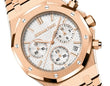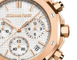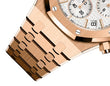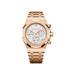 Unworn Audemars Piguet Royal Oak SELFWINDING CHRONOGRAPH "50TH ANNIVERSARY" 26240OR.OO.1320OR.03. 41 mm, Silver-toned dial with “Grande Tapisserie” pattern, silver-toned counters, pink gold applied hour-markers and Royal Oak hands with luminescent coating, 18-carat pink gold case, glareproofed sapphire crystal and caseback, screw-locked crown, 4401 calibre, Selfwinding movement, 70 h power reserve, 40 jewels, 18-carat pink gold bracelet with AP folding clasp. Water resistant to 50 m.