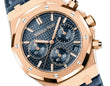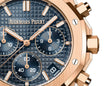 Unworn Audemars Piguet Royal Oak SELFWINDING CHRONOGRAPH "50TH ANNIVERSARY" 26240OR.OO.D315CR.01. 41 mm, “Bleu nuit nuage 50” dial with “Grande Tapisserie” pattern, “Bleu nuit nuage 50” counters, pink gold applied hour-markers and Royal Oak hands with luminescent coating, 18-carat pink gold case, glareproofed sapphire crystal and caseback, screw-locked crown, 4401 calibre, Selfwinding movement, 70 h power reserve, 40 jewels, Blue alligator strap with 18-carat pink gold AP folding clasp. Water resistant to 50 m.