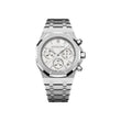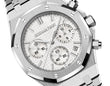 Unworn Audemars Piguet Royal Oak SELFWINDING CHRONOGRAPH "50TH ANNIVERSARY" 26240ST.OO.1320ST.03. 41 mm, Silver-toned dial with “Grande Tapisserie” pattern, silver-toned counters, white gold applied hour-markers and Royal Oak hands with luminescent coating, Stainless steel case, glareproofed sapphire crystal and caseback, screw-locked crown, 4401 calibre, Selfwinding movement, 70 h power reserve, 40 jewels, Stainless steel bracelet with AP folding clasp. Water resistant to 50 m.