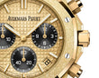 Unworn Audemars Piguet Royal Oak SELFWINDING CHRONOGRAPH 26240BA.GG.1324BA.01. 41 mm, Yellow gold-toned dial with “Grande Tapisserie” pattern, black counters, yellow gold applied hour-markers and Royal Oak hands with luminescent coating, Hammered 18-carat yellow gold case, glareproofed sapphire crystal, screw-locked crown, 4401 calibre, Selfwinding movement, 70 h power reserve, 37 jewels, Hammered 18-carat yellow gold bracelet with AP folding clasp. Water resistant to 50 m.