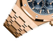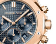 Unworn Audemars Piguet Royal Oak SELFWINDING CHRONOGRAPH 26715OR.OO.1356OR.01. 38 mm, Bleu nuit nuage 50 dial with “Grande Tapisserie” pattern, “Bleu nuit nuage 50” counters, pink gold applied hour-markers and Royal Oak hands with luminescent coating, 18-carat pink gold case, glareproofed sapphire crystal and caseback, screw-locked crown, 2385 calibre, Selfwinding movement, 40 h power reserve, 37 jewels, 18-carat pink gold bracelet with AP folding clasp. Water resistant to 50 m.