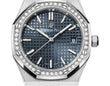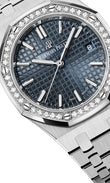 Unworn Audemars Piguet Royal Oak SELFWINDING 77351ST.ZZ.1261ST.01. 34 mm, Blue-grey dial with “Grande Tapisserie” pattern, white gold applied hour-markers and Royal Oak hands with luminescent coating, Stainless steel case, diamond-set bezel, glareproofed sapphire crystal and caseback, 5800 calibre, Selfwinding movement, 28 jewels, 50 h power reserve, Stainless steel bracelet with AP folding clasp. Water resistant to 50 m.