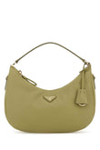 Elevate your everyday style with this stunning sage green leather handbag from Prada. Crafted from luxurious pelle leather, this hobo-style shoulder bag features a curved silhouette that effortlessly combines sophistication with casual elegance.