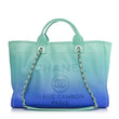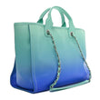 This is an authentic CHANEL Shaded Calfskin Medium Deauville Tote Light Green, Turquoise, and Purple. This stylish tote is crafted of gradient calfskin with an embossed Rue Cambon Paris logo on the front. It features rolled leather top handles and leather threaded silver chain shoulder straps. The bag opens to a turquoise fabric interior with zipper and patch pockets, and a removable pouch.