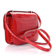 This is an authentic HERMES Shiny Alligator Constance 18 in Rouge de Coeur. This stylish shoulder bag is finely crafted of polished red alligator leather. The bag features a long shoulder strap with palladium hardware including an H buckle at the flap. This opens to a compact partitioned leather interior with flat pockets.