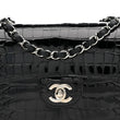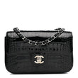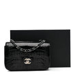This is an authentic CHANEL Shiny Alligator Mini Flap in Black. This stylish shoulder bag is crafted of black alligator leather. The bag features a silver chain shoulder strap interwoven with leather and a full frontal flap with the classic silver CC turn lock. The flap opens to a matching leather interior with a patch and zipper pocket.