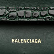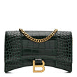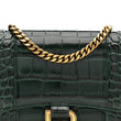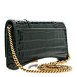 This is an authentic BALENCIAGA Shiny Calfskin Crocodile Embossed Hourglass Chain Bag in Forest Green. This mini crossbody is crafted of dark green crocodile embossed calfskin leather with aged gold hardware. The flap opens to a green leather interior with a zipper pocket, patch pocket and card slots.