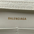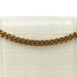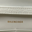 This is an authentic BALENCIAGA Shiny Calfskin Crocodile Embossed Hourglass Chain Bag in White. This stylish petite handbag is beautifully crafted of crocodile embossed calfskin leather in white. It features an optional shoulder strap. This bag also features the signature Balenciaga B charm, aged gold hardware, and a slip pocket at back. The front flap opens to a leather interior with card slots and a zipper pocket.