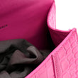 This is an authentic BALENCIAGA Shiny Calfskin Crocodile Embossed Hourglass Top Handle Bag XS in Neon Pink. This stylish and structured handbag is crafted of crocodile embossed in bright pink calfskin leather. The bag features a sturdy leather top handle with ruthenium links and a prominent B logo on the front flap, and an optional, adjustable shoulder strap. The front flap opens with a magnetic snap closure to a smooth pink leather compact interior.
