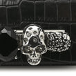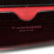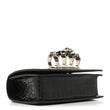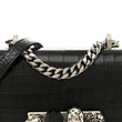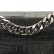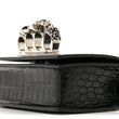 This is an authentic ALEXANDER MCQUEEN Shiny Crocodile Embossed Mini Jeweled Satchel in Black. This chic shoulder bag is crafted of crocodile embossed calfskin in black. The bag features a silver chain shoulder strap with a crocodile embossed calfskin leather shoulder pad and the front flap features the signature Alexander McQueen skeletal knuckle embellishments. The front flap opens to a red interior with a card slot panel.