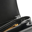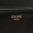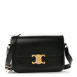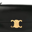 This is an authentic CELINE Shiny Calfskin Medium Triomphe in Black. This chic shoulder bag is crafted of smooth calfskin leather in black. The bag features an adjustable leather shoulder strap with gold hardware, and a matching gold press lock on the crossover flap that opens to a partitioned black leather interior with a zipper pocket.