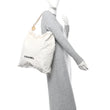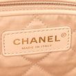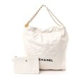 This is an authentic CHANEL Shiny Calfskin Quilted Chanel 22 in White and Black. This chic bag is crafted of shiny diamond-stitched calfskin leather in White. The bag features a leather-threaded aged gold chain shoulder strap with a Chanel CC medallion, and a black Chanel logo on the front of the bag. The top is open to a light beige diamond-stitched fabric interior with a zipper pocket and matching removable pouch.