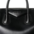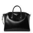 This is an authentic GIVENCHY Shiny Lord Calfskin Large Antigona in Black. This elegant handbag is crafted of polished calfskin leather in black. The bag features rolled leather top handles with polished silver hardware, a removable shoulder strap, and signature extended sides. The top zipper opens to a black fabric interior with a zipper and patch pockets.