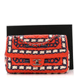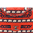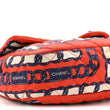 This is an authentic CHANEL Silk Chain Printed Medium Single Flap in Red. This shoulder bag is crafted of printed fabric flap with a splash of multicolors. The shoulder bag features a fabric threaded silver chain link shoulder strap, and a silver CC turn lock. The flap opens to a matching red fabric interior with a zipper pocket.
