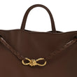 This is an authentic BOTTEGA VENETA Silky Calfskin Medium Andiamo Shoulder Bag in Sapele and Redstone. This bag is crafted of brown lambskin leather with a red woven insert and gold hardware. The top opens to a brown suede interior.