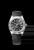 Unworn watch Rolex Sky-Dweller, 42mm, 18k White Gold, Ref# 336239-0002. New for 2023, a true masterpiece of engineering. Elegant and versatile, this stunning timepiece is the perfect luxury accessory for the modern traveler. This superb chronometer features a Black dial, which is the perfect backdrop for the luminous 18k White Gold index hour markers and hands, making it easy to read the time even in low light conditions. A well-readable minute scale is applied along the outer contour of the dial. The sophisticated multi-function display makes it easy to keep track of the time in two different time zones. The reference time is displayed in 24-hour format on an off-center dial, while the local time is read using the normal central hands. The annual calendar, named Saros, is powered by a patented mechanism and features an innovative display: the months of the year are shown in 12 windows around the circumference of the dial, behind the hour marker - the current month is displayed in red. The instantaneous date change is related to local time. The ribbed, easy-to-grip Triplock 18k White Gold screw-down crown features a triple water-resistance system in and Rolex logo decorated. The dial is covered with a scratch-resistant sapphire crystal with anti-reflective coating and Cyclops lens at the 3 o'clock position. The fluted bezel in 18k White Gold is a true hallmark of Rolex. Bidirectional rotatable, it is part of the Ring Command system and, when interacting with the crown, allows the user to select watch functions one by one and adjust them easily, quickly and simply. The model is powered by the innovative in-house Rolex mechanical movement, caliber 9002, contains 29 jewels and has an approximate power reserve of approximately 72 hours. This delightful watch is presented on an Oysterflex bracelet consisting of flexible metal blades coated with high performance elastomer, featuring a patented longitudinal cushion system that stabilizes the watch on the wrist, and fitted with an 18k White Gold Oysterclasp clasp. It also features the Rolex Glidelock extension system, developed and patented by the brand. Water resistant up to 100m/330ft (10 ATM).