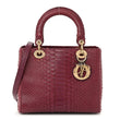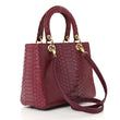 This is an authentic CHRISTIAN DIOR Snakeskin Medium Lady Dior in Purple. This ombre mini tote is crafted of snakeskin leather in purple. The bag features matching top handles, an optional shoulder strap, complimented by polished gold hardware including handle rings, large decorative eyelets and a hanging Dior logo charm. The top zipper opens to a purple leather interior with a zipper pocket.