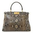 This is an authentic FENDI Snakeskin Medium Peekaboo Iconic Satchel in Asfalto Nocciola. This stylish tote is crafted of grey snakeskin. This bag features a top handle and a structured frame secured by a turn lock on both sides. This bag opens to a dark beige suede and interior with a zipper pocket.