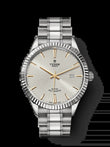 Unworn watch Tudor Style, polished and satin finish Stainless Steel, 41mm, Ref# M12710-0005. Classic and elegance are the essential hallmarks of Tudor Style watches. A chic watch with a hint of retro harmoniously combines sensuality and performance. They are perfect for all occasions. The delicate Silver dial with a special sunbeam treatment is lacquered for added depth. It is adorned with hour markers inspired by 1950s watches. The 12 and 6 o'clock position is highlighted by the famous double Yellow Gold indexes, which are meticulously finished, which emphasizes the modernity of the model. The rest of the hour markers are three-dimensional Yellow Gold sticks with a beautiful chamfer on four sides, giving the watch a bright glow. A distinctive feature of the aesthetics of the watch are Yellow Gold dauphine-style shape hands. Bright and stylish, this watch has a minute-second scale around the outer perimeter of the dial and a date window at the 3 o'clock position, which enhances its readability. Complementing all this charm is the cone-shaped screw-down Stainless Steel crown, bearing the TUDOR logo, for a fluid design. The dial closed by a Scratch-resistant Sapphire Crystal. The watch mechanism is sewn up by a solid Stainless Steel case back. An elegant feature of the model is the fluted fixed Stainless Steel bezel. The model is equipped with a manufacture Tudor self-winding mechanical movement Calibre T601, contains 25/26 jewels and has an approximate power reserve approximately of 38 hours. This bright timepiece is presented on Stainless Steel bracelet with five links (three wide and two narrow), refined with an alternation of polished and satin finishes. The folding clasp, made using our own unique Tudor technologies, guarantees maximum comfort on the wrist. Water resistant up to 100m/330ft (10 ATM).