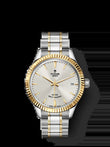 Unworn watch Tudor Style, polished and satin finish Stainless Steel, 34mm, and Ref # M12313-0003. Classic and elegance are the essential hallmarks of Tudor Style watches. A chic women's watch with a hint of retro, harmoniously combines sensuality and performance. They are perfect for all occasions. The delicate Silver sunray dial treatment is lacquered for added depth. Three-dimensional rods with beautiful beveling on four sides of Yellow Gold, including the famous double index at 12 and 6 o'clock, give the watch a brilliant glow. A distinctive feature of the aesthetics of the watch are Yellow Gold dauphine-style shape hands. Bright and stylish, this watch has a minute-second scale around the outer perimeter of the dial and a date window at the 3 o'clock position, which enhances its readability. Complementing all this charm is the cone-shaped screw-down Stainless Steel crown, bearing the TUDOR logo, for a fluid design. The dial closed by a Scratch-resistant Sapphire Crystal. The watch mechanism is sewn up by a solid Stainless Steel case back. An elegant feature of the model is the fixed fluted Yellow Gold bezel. The model is equipped with a manufacture Tudor self-winding mechanical movement Calibre T601, contains 25/26 jewels and has an approximate power reserve approximately of 38 hours. This bright timepiece is presented on Stainless Steel and Yellow Gold bracelet with five links (three wide Stainless Steel links and two narrow Yellow Gold inserts between them), refined with an alternation of polished and satin finishes. The folding clasp, made using our own unique Tudor technologies, guarantees maximum comfort on the wrist. Water resistant up to 100m/330ft (10 ATM).