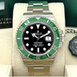 Unworn Rolex watch Submariner Date, 41mm of brushed Oystersteel case with polished finished sides, Reference 126610LV-MK2. Elegant and versatile, this luxury timepiece is the perfect accessory for the modern traveler. The stunning chronometer features a black lacquered dial with a crisp Chromalight display with a long blue glow that is the perfect backdrop for the luminous Silver-tone hour markers in rectangles, circles and an inverted triangle at 12 o'clock. The polished Mercedes-branded hour hand and the Breguet-style sword-shaped minute hand are filled with long-lasting luminous material. The delicate second hand with a round tip and a luminous circle in front of the hand for maximum precision perfectly fits into the modern design of the accessory. On the outer contour of the dial, there is a printed, white well-read minute/seconds track. Polished Oystersteel patented "Triplock" locking crown ensuring that the crown screws down onto the Oyster case as securely as a submarine hatch. The dial closed by a Scratch-resistant Sapphire Crystal and Oystersteel solid case back made. Date window at 3 o'clock with a cyclops magnifier. The watch is equipped unidirectional rotatable polished Oystersteel bezel with knurled corners for enhanced grip. Green "Cerachrom" bezel insert, made of ceramic which is extremely hard, durable and highly scratch-resistant. Ceramic has excellent corrosion resistant properties and is unaffected by ultraviolet rays so the color will not fade. It features a 60-minute immersion scale engraved in Platinum with a large luminous point at the origin. The movement is mechanical self-winding 3235, containing 31 Jewels and 70 hours of power reserve. This delightful timepiece is presented on a Rolex Oyster bracelet of three solid links crafted made from brushed Oystersteel with folding Oysterlock safety clasp with Rolex Glidelock extension system. The water resistance is up to 300 meters/1000 feet.