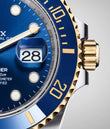 Rolex Submariner Date, 41mm watch of polished Stainless Steel and 18k Yellow Gold. This model has blue dial with a polished 18k Yellow Gold hour, minute and seconds hands in Mercedes-logo and Breguet-style sword shape with luminous fill. Applied polished 18kt Yellow Gold rimmed doty and index hour markers with luminous fill. Fine printed minute/seconds track on the dial rim. Highly legible Chromalight display with long-lasting blue luminescence. Polished 18kt Yellow Gold patented "Triplock" locking crown ensuring that the crown screws down onto the Oyster case as securely as a submarine hatch. The dial closed by a Scratch-resistant Sapphire Crystal and solid case back made. The Watch has Centre hour minute and seconds hands. Stop-seconds for precise time setting. Date window at 3 o'clock with a cyclops magnifier. The watch is equipped unidirectional rotatable polished 18k Yellow Gold bezel with knurled corners for enhanced grip. Blue "Cerachrom" bezel insert, made of ceramic which is extremely hard, durable and highly scratch-resistant. Ceramic has excellent corrosion resistant properties and is unaffected by ultraviolet rays so the color will not fade. It features a 60-minute immersion scale engraved in yellow gold with a luminous point at the origin. The movement is mechanical self-winding 3235, containing 31 Jewels and 70 hours of power reserve. The Rolex Oyster bracelet of brushed outer links Stainless Steel and polished center links 18k Yellow Gold with folding Oysterlock safety clasp with Rolex Glidelock extension system. The water resistance is up to 300 meters/1000 feet.