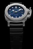 Unworn Men’s Watch Panerai Submersible BMG -Tech - 47mm, case of Titanium and BMG-Tech (a bulk metallic glass with a disordered atomic structure), Reference PAM00692. The model has Blue dial with luminous Index hour markers at 6 and 12 o'clock positions and rest of the hour markers in the form of large dots with luminescent filling. This watch is bold the iconic large silver-tone skeleton sword-shaped different hands of polished steel with bold luminescent fill. Date window located 3 o'clock position. Also watch has one-small second subdial at 9 o’clock. The dial closed by a Scratch-resistant Sapphire Crystal. The watch has Panerai's (protected as a trademark) instantly recognizable crown protector and screws down the crown of polished steel with a ribbed edge for a comfortable grip. They have case shape Cushion and solid case back of Titanium made. The watch is equipped anti-clockwise rotating bezel of BMG-Tech ™ with a graduated 15-minute scale. It also has luminous raised points at 5-minute intervals, marked separately for 15, 30 and 45 minutes, and a large point at the origin. The Model comes with Panerai Caliber P.9010 automatic movement, containing 31 Jewels and has a power reserve of approximately 72 hours. The watch presented on a black rubber strap secured by a Tang buckle. The water resistance is up to 300m/1000ft.