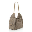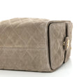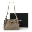 This is an authentic CHANEL Suede Quilted Small Chanel 25 Handbag in Grey. This slouchy shoulder bag is crafted with luxurious taupe grey quilted suede leather. The bag features two side pockets with an aged gold CC logo. It also features an aged gold chain link leather threaded shoulder strap and drawstring closure with a push-lock CC. The bag opens to a grey fabric interior with a leather patch pocket.