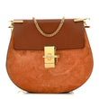 This is an authentic CCHLOE Suede Smooth Calfskin Drew Shoulder Bag Classic in Tobacco. This chic messenger style bag is crafted of luxurious suede calfskin leather in two lovely shades of brown. The bag features a chain shoulder strap and brass hardware including a magnetic peg-and-eye turn-lock closure. This opens to an ivory suede interior with a hanging pocket.