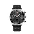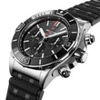 Breitling Super Chronomat B01. Anthracite dial 44 mm Stainless Steel case. Unidirectional ratcheted rotating bezel. Cambered sapphire, glareproofed both sides crystal. Breitling 01 calibre, Self-winding mechanical, 70 hours power reserve, 47 jewels. Rubber strap Fold clasp. Water resistance 200 m (660 ft).
