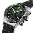 Introducing the unworn Breitling Super Chronomat B01 44, an epitome of power and precision. With its robust 44mm stainless steel case, this timepiece exudes strength and durability. The bold Green dial with black sub-dials features applied index hour markers and luminous hands, ensuring optimal readability in any lighting condition. The Model comes with Self-winding mechanical the Breitling Caliber B01, renowned for its precision and reliability, has 47 jewels and a remarkable 70-hour power reserve, ensuring precise timekeeping. The watch have a function chronograph, including a central seconds hand, 30-minute counter, and 12-hour counter, providing precise timing for any occasion. Thanks to the sapphire crystal caseback, you can admire the magical work of the mechanism. Its unidirectional rotating Polished stainless steel bezel ring with polished black ceramic insert featuring raised 15 minute tabs adds both style and functionality, while the scratch-resistant sapphire crystal ensures lasting clarity. The black rubber strap is secured with a stainless steel folding clasp for style and comfort. Having Water-resistant up to 200 meters, watch ready for any adventure.