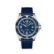 Sporty, fresh and colorful Breitling Superocean Automatic 44 watch, 44mm, Stainless Steel case, Reference A17367D81C1S1. This model has Matte Blue dial with applied large luminous index hour markers with lumincent fill and applied polished Large Arabic numerals mark the 6, 9, and 12 o'clock positions with lumincent fill. The dial is adorned polished grey hands, the hours and minute hands with luminous filled tips and Red-tipped seconds hand. Fine printed minute track on teh dial perimeter with Arabic numerals marking every 5-minute interval. The date displayed at the 3 o'clock position. Screw-locked crown with two gaskets and logo Breitling. The dial closed by a convex sapphire crystal, glare-proofed both sides and solid case back. The watch is equipped unidirectional rotating stainless steel bezel with a Matte Blue ring with engraved Arabic numerals and indexes. Breitling Caliber 17 contains 25 Jewels and has an approximate power reserve of 38 hours. The watch presented on a Blue Rubber Diver Pro III strap with Stainless Steel Tang Buckle Clasp. The water resistance is up to 1000m (3300ft).