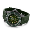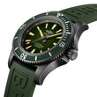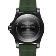 Breitling Superocean Automatic Black Steel. Green dial 46 mm DLC-Coated Stainless Steel case. Unidirectional, ratcheted bezel, Convex sapphire crystal, glareproofed both sides crystal. Breitling 17 calibre, self-winding mechanical, 38 hrs power reserve, 26 jewels. Rubber strap Pushbutton folding clasp. Water resistance 2,000 m (6,600 ft).