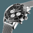 Breitling Superocean Heritage B01 Chronograph 44 watch, polished stainless steel case 44mm, Reference AB0162121B1A1. The model has Black dial with silver sub-dials and a "B" emblem below the 12 o'clock position. This watch is bold the iconic triangular-shaped large silver-tone different hands of polished steel with bold luminescent fill and applied polished stainless steel index hour markers with painted luminescent dot hour markers. Fine printed minute/seconds track on the outer perimeter. Date window located between the 4 and 5 o'clock position. The dial closed by a Cambered Scratch-resistant Sapphire Crystal with glare-proofed both sides. The watch has polished Stainless steel screw-locked crown with two gaskets. The crown has a ribbed edge for a comfortable grip. On end there is Breitling logo is applied. They have transparent case back of Sapphire Crystal made. The watch is equipped Stainless Steel unidirectional-ratcheted rotating fluted bezel with a black ceramic top ring with silver in the form of index markers and a triangle at the origin. The Model comes with Breitling Caliber B01 contains 47 Jewels and has an approximate power reserve of 70 hours. The watch presented on the polished Aero Classic bracelet with Folding Clasp with Safety Latch. The water resistance is up to 200m/660ft.
