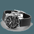 Breitling Superocean Heritage B20 Automatic 44 watch, polished stainless steel case 44mm, Reference AB2030121B1S1. The model has Black dial and is bold the iconic triangular-shaped large silver-tone different hands of polished steel with bold luminescent fill and applied polished stainless steel index hour markers with painted luminescent dot hour markers. Fine printed minute/seconds track with 15-minute Arabic numerals intervals on the outer perimeter. Date window located at the 6 o'clock position. The dial closed by a Cambered Scratch-resistant Sapphire Crystal with glare-proofed both sides. The watch has polished Stainless steel screw-locked crown with two gaskets. The crown has a ribbed edge for a comfortable grip and Breitling logo. They have solid screwed case back of Stainless steel. The watch is equipped Stainless Steel unidirectional-ratcheted rotating fluted bezel with a black ceramic top ring with silver in the form of index markers and a triangle at the origin. The Model comes with Breitling Caliber B20, beats at 28'800 vph, contains 26 Jewels and has an approximate power reserve of 70 hours. The watch presented on the Black Rubber Aero Classic strap with Push Button Folding Clasp. The water resistance is up to 200m/660ft.