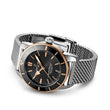 Breitling Superocean Heritage B20 watch, 44mm, polished stainless steel case. Black dial with an 18k Red gold tone "B" emblem below the 12 o'clock position. Applied polished red gold index and painted luminous dot hour markers. Polished red gold hands, the hour and minute hands with luminous fill. Printed minute/seconds track. Date window located at the 6 o'clock position. The dial closed by a scratch-resistant sapphire crystal glare proofed both sides. Screw-down screw-locked crown with two gaskets. Solid case back. Unidirectional rotating bezel of 18kt red gold with a black ceramic top ring. The Watch comes with Breitling Caliber B20, beats at 28'800 vph, contains 26 Jewels and has an approximate power reserve of 70 hours. The watch presented on the Ocean Classic bracelet of Stainless Steel with Fold over clasp with a safety release. The water resistance is up to 200m/660ft.