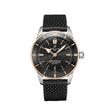 Breitling Superocean Heritage B20 watch, 44mm, polished stainless steel case. Black dial with an 18k Red gold tone "B" emblem below the 12 o'clock position. Applied polished red gold index and painted luminous dot hour markers. Polished red gold hands, the hour and minute hands with luminous fill. Printed minute/seconds track. Date window located at the 6 o'clock position. The dial closed by a scratch-resistant sapphire crystal glare proofed both sides. Screw-down screw-locked crown with two gaskets. Solid case back. Unidirectional rotating bezel of 18kt red gold with a black ceramic top ring. The Watch comes with Breitling Caliber B20, beats at 28'800 vph, contains 26 Jewels and has an approximate power reserve of 70 hours. The watch presented on the Black Rubber Aero Classic strap with Stainless Steel Push button folding clasp. The water resistance is up to 200m/660ft.