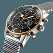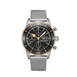 Breitling Superocean Heritage Chronograph 44 watch, polished stainless steel and 18k Red Gold, 44mm case, Reference U13313121B1A1. This model has Black dial with gold-rimmed black subdials. This watch is bold the iconic triangular-shaped large different hands of polished 18k Red Gold with bold luminescent fill and applied polished 18k Red Gold index hour markers with painted luminescent dot hour markers. Fine printed minute/seconds track intervals on the outer perimeter dial. Day of the week and Date Window located the 3 o'clock position. The watch has polished stainless steel screw-locked crown with two gaskets. The crown has a ribbed edge for a comfortable grip and Breitling logo. On the right side case also houses the chronograph stainless steel buttons a cylindrical shape. The dial closed by a Cambered Scratch-resistant Sapphire Crystal with glare-proofed both sides. The Watch have solid screwed case back of Stainless steel. Chronograph/Stopwatch functions: large central seconds counter hand; 30-minute counter sub-dial located at the 12 o'clock position; 12-hour counter sub-dial at the 6 o'clock position. Small seconds hand sub-dial located at the 9 o'clock position. The watch is equipped unidirectional rotating coin edge 18k Red Gold bezel with a black polished ceramic ring. The Watch comes with Breitling Caliber 13, beats at 28'800 vph, contains 25 Jewels and has an approximate power reserve of 48 hours. The watch presented on the polished Stainless Steel Mesh Bracelet with Folding Clasp with Safety Latch. The water resistance is up to 200m/660ft.