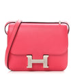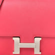 This is an authentic HERMES Swift Constance 18 in Rose Extreme. This is a chic small bag that is finely crafted of luxurious swift calfskin leather in pink. The shoulder bag features a leather shoulder strap, a front flap, and a Palladium Hermes H push-lock closure. The flap opens to a partitioned leather interior with a patch pocket.