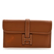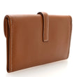 This is an authentic HERMES Swift Jige Duo Clutch in Gold. This elegant neutral clutch bag is crafted of luxurious swift calfskin leather in tan brown. There is a cross-over flap and a strap that tucks under a leather Hermes "H." This opens to a leather interior with patch pockets.