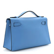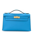 This is an authentic HERMES Swift Kelly Pochette Clutch Bleu Frida. This clutch is crafted of bright blue smooth swift calfskin. It features a leather top handle and a strap closure with a gold-plated turn lock that opens to a matching leather interior with a patch pocket.