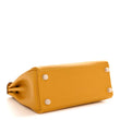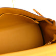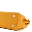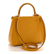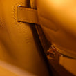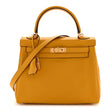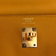 This is an authentic HERMES Swift Kelly Retourne 25 in Jaune Ambre. This iconic handbag is crafted of luxurious calfskin leather in yellow. The bag features a sturdy leather top handle, an optional shoulder strap, a crossover flap with belt straps, and a polished gold plated turn-lock that can be secured with the padlock and keys. This opens to a matching matte leather interior with a zipper pocket and patch pocket.