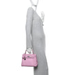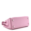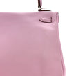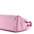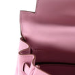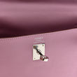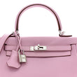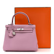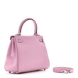 This is an authentic HERMES Swift Kelly Retourne 25 in Mauve Sylvestre. This chic and iconic handbag is expertly handcrafted of luxurious calfskin leather in light pink. The bag features a rolled leather top handle, an optional shoulder strap, and a front flap with a strap closure and silver palladium plated hardware including a padlock and covered key clochette. The bag opens to a matching leather interior with zipper and patch pockets.