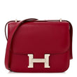 This is an authentic HERMES Box Tadelakt 18 in Rubis. This is a chic small bag that is finely crafted of luxurious Tadelakt leather in red. The shoulder bag features a leather shoulder strap, a front flap and a palladium Hermes H logo. The flap opens to a partitioned leather interior with a patch pocket.