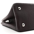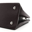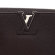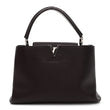 This is an authentic LOUIS VUITTON Taurillon Capucines MM in Quetsche. This stylish handbag tote is crafted of beautifully textured Taurillon calfskin leather in dark purple. The bag features a reinforced looping rolled leather top handle with polished silver ring links and a leather lined silver Louis Vuitton logo. The interior is a partitioned beige pink leather with a patch pocket and a central zipper compartment.